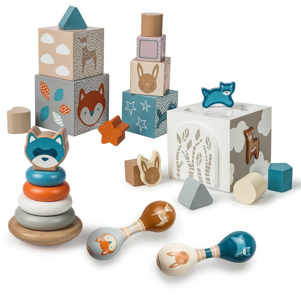 キツネ、アライグマ、バンビ、ウサギの4種類の森林動物をモチーフにした知育玩具のシリーズです。北欧の洗練されたデザインと温かみのある優しい色使いが大人気。丈夫で安全なブナの木材を使っているので、小さなお子様にも安心の高品質です。